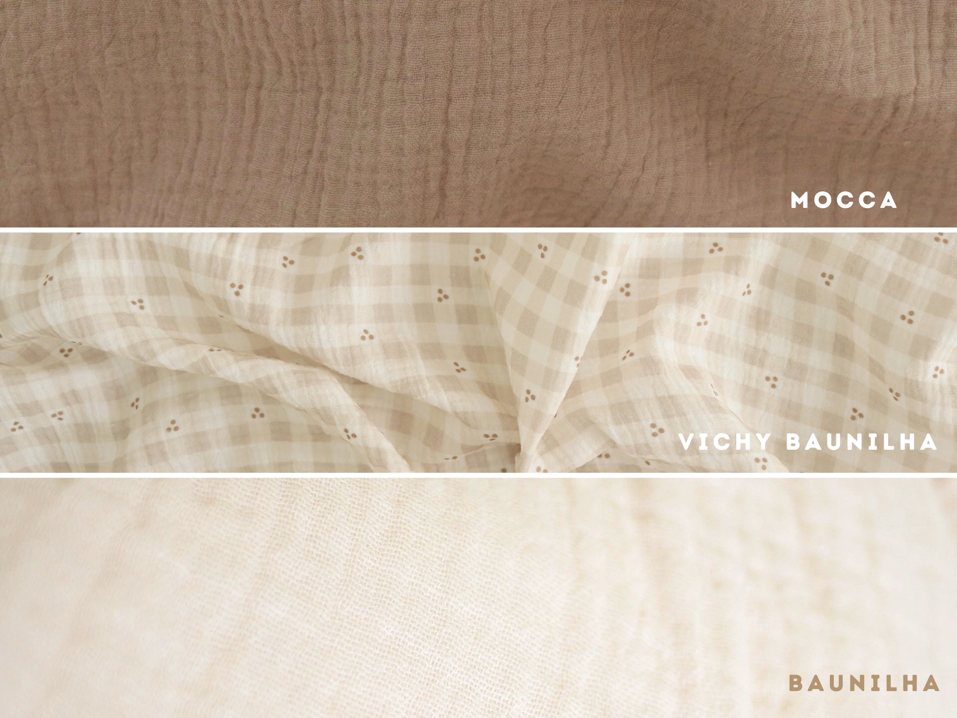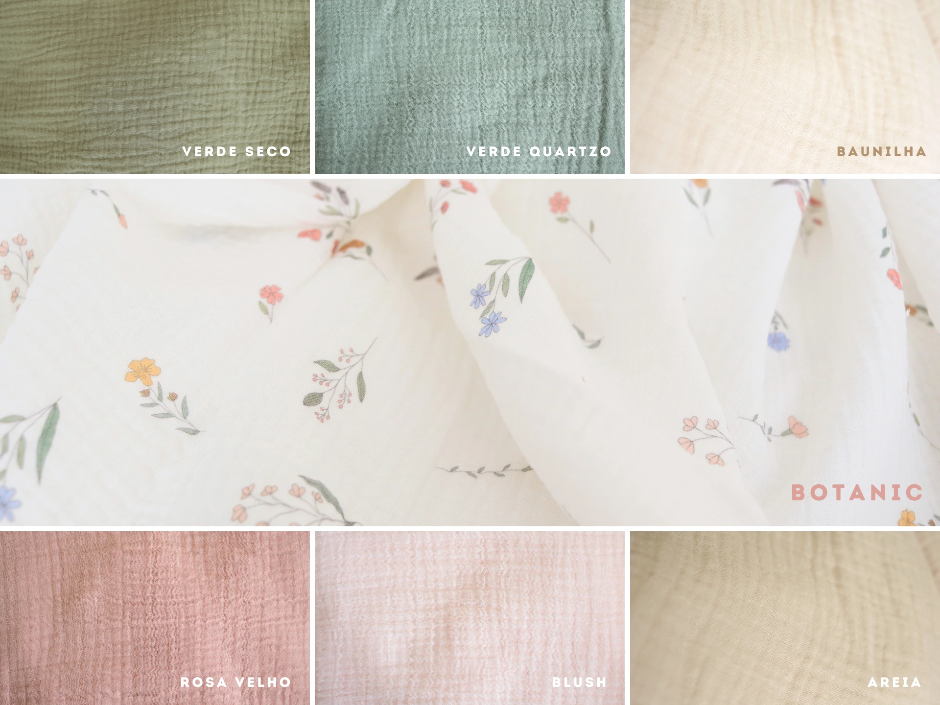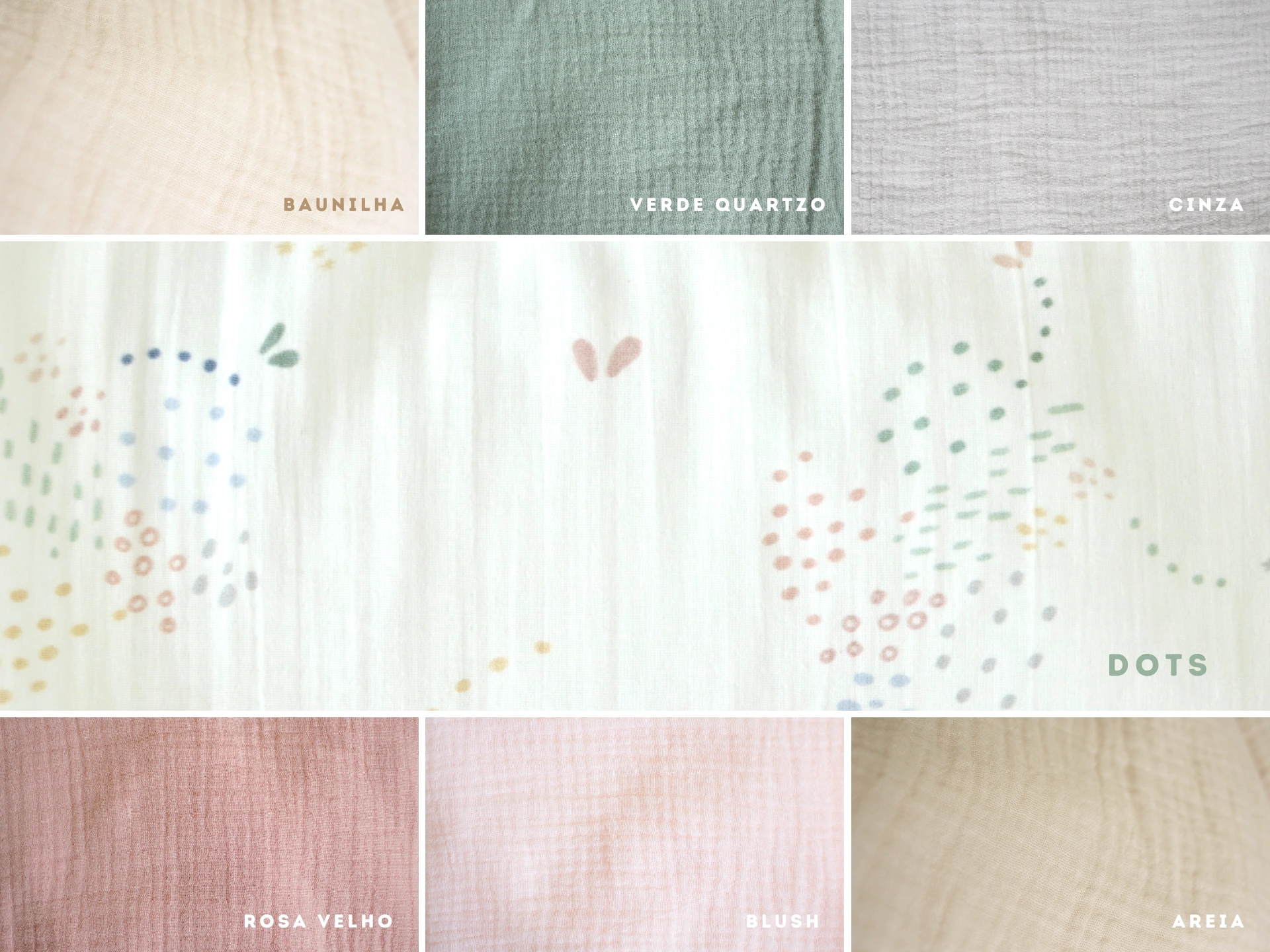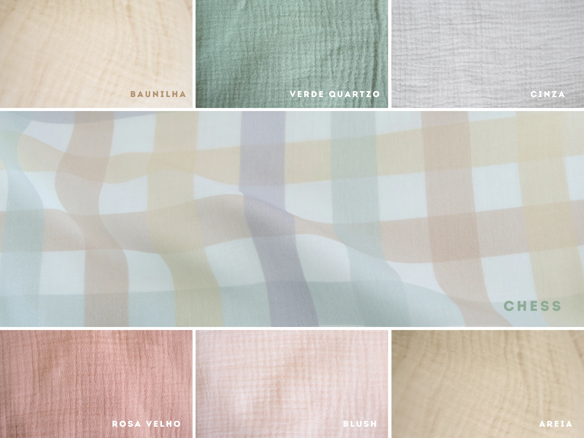 | Cor | Areia, Blush, Branco, Cinza, Dots, Rosa Velho, SeaGull, Verde Quartzo, Verde Seco, Baunilha, Botanic, Chess, Mocca, Portobello, Seeds, Vichy Baunilha |
